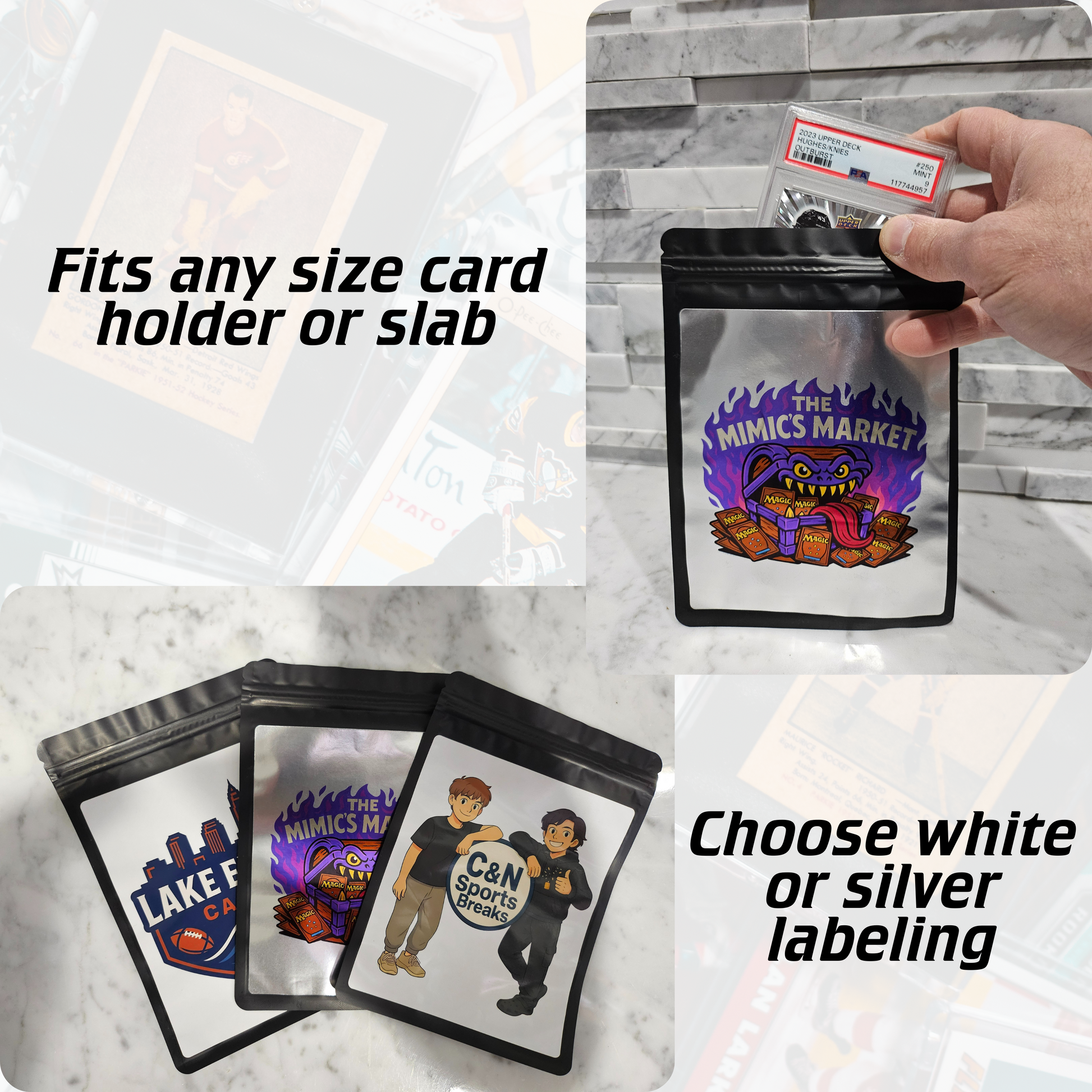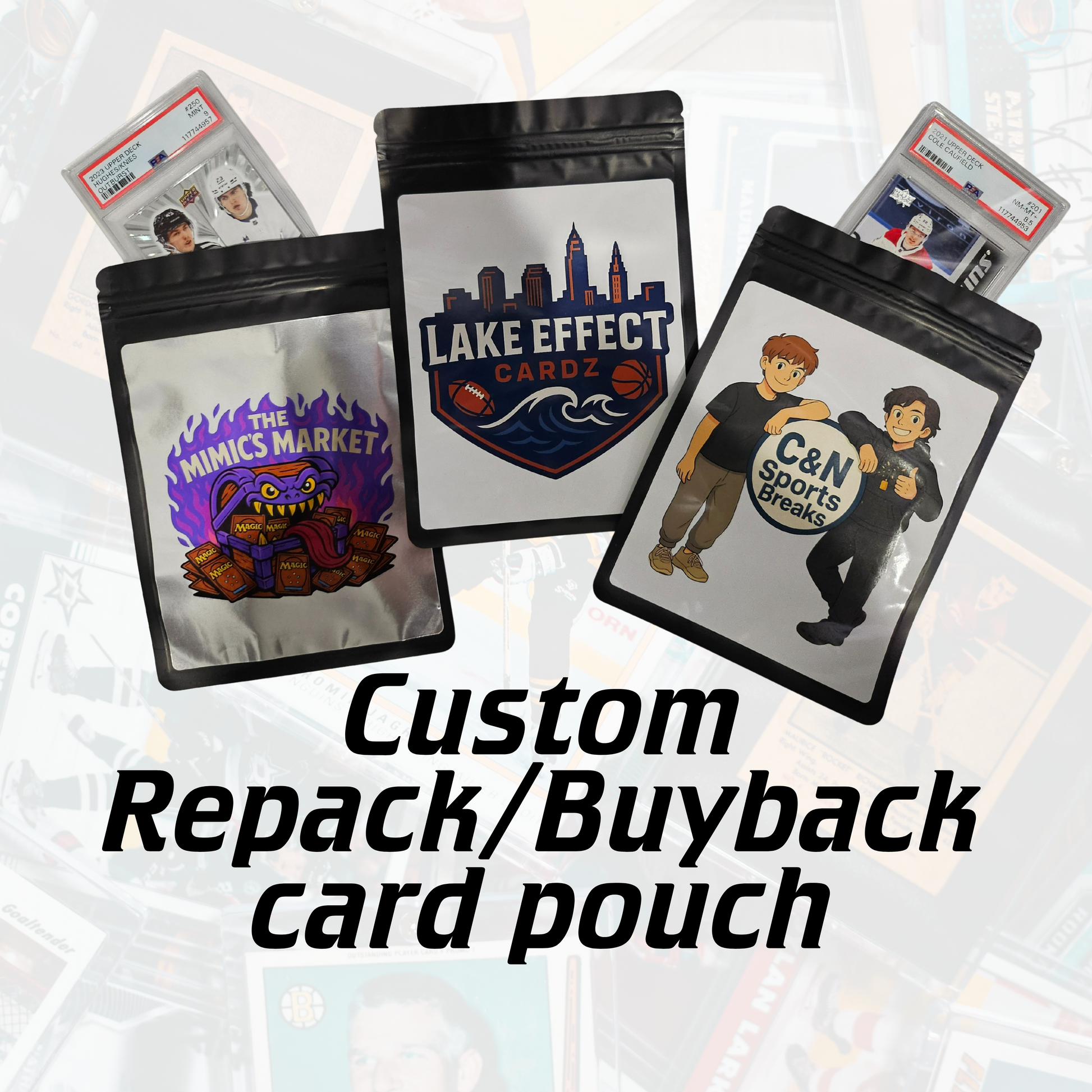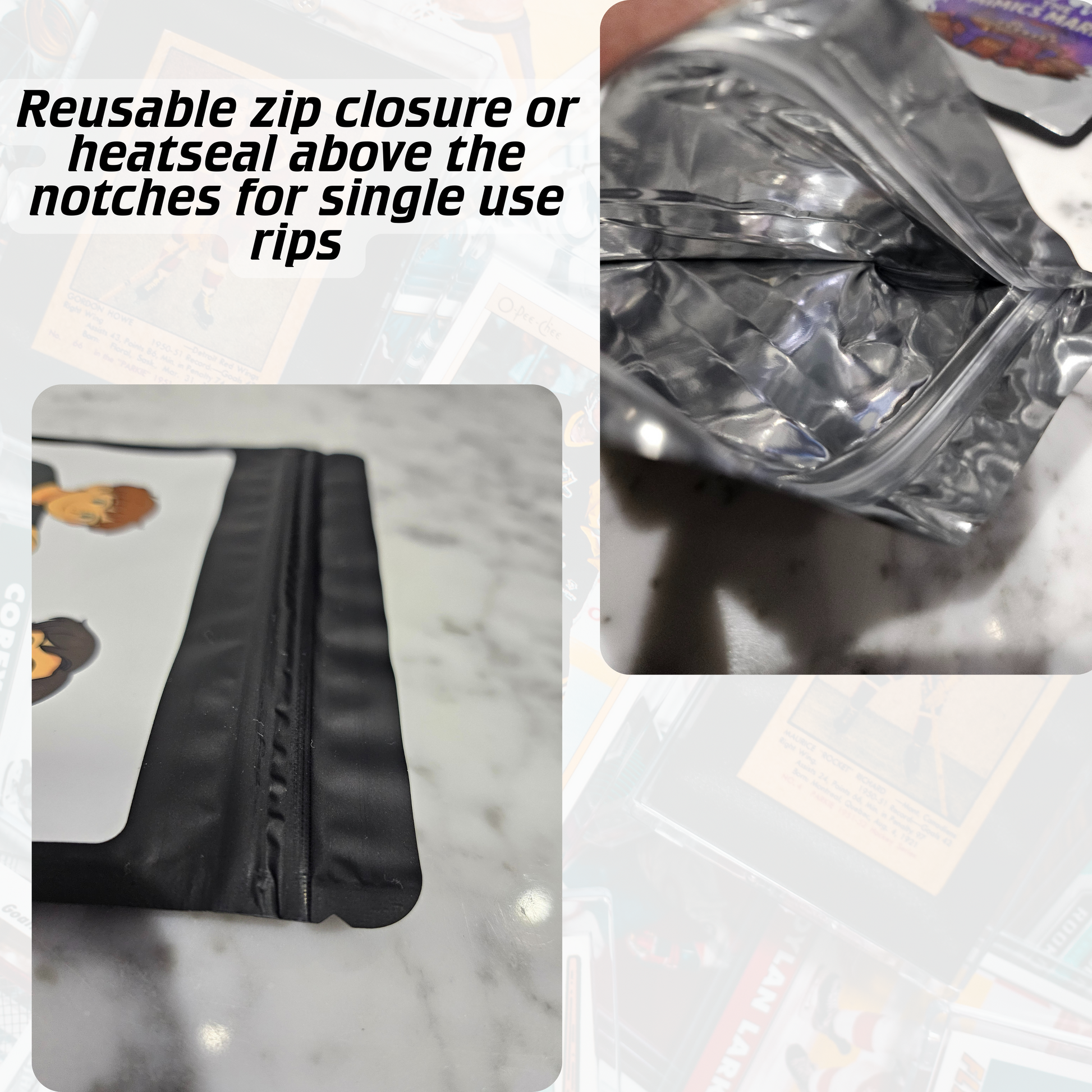 High end trading card repack bags for your card breaks or surprise TCG rip packs. Take your card breaks higher with these card breakers repack (aka buybacks) pouches. They are reusable infinite times using the zip closure, or heat seal above the zip for a more permanent or single use function. Perfect for hockey, basketball, baseball, football, or pokemon cards.
